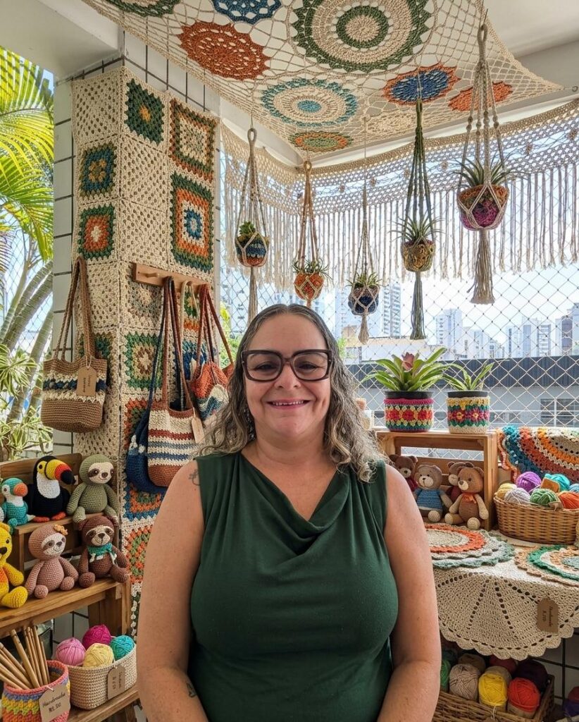 Para Deocleide, cada técnica exige um olhar diferenciado. Enquanto define o crochê como uma atividade dinâmica e fluida no manuseio das agulhas e pontos, ela reserva ao bordado um cuidado minucioso, onde o segredo reside no capricho e na atenção aos detalhes. Sua produção é vasta e diversificada, abrangendo desde a criação de acessórios modernos, como bolsas, até a delicadeza dos amigurumis e itens de decoração, como souplats. Embora as peças de vestuário representem um desafio técnico que ela encara com coragem, é na variedade de “um pouco de tudo” que ela atende ao seu público, dedicando de dois dias a mais de uma semana para concluir cada obra, a depender da complexidade e do material utilizado.