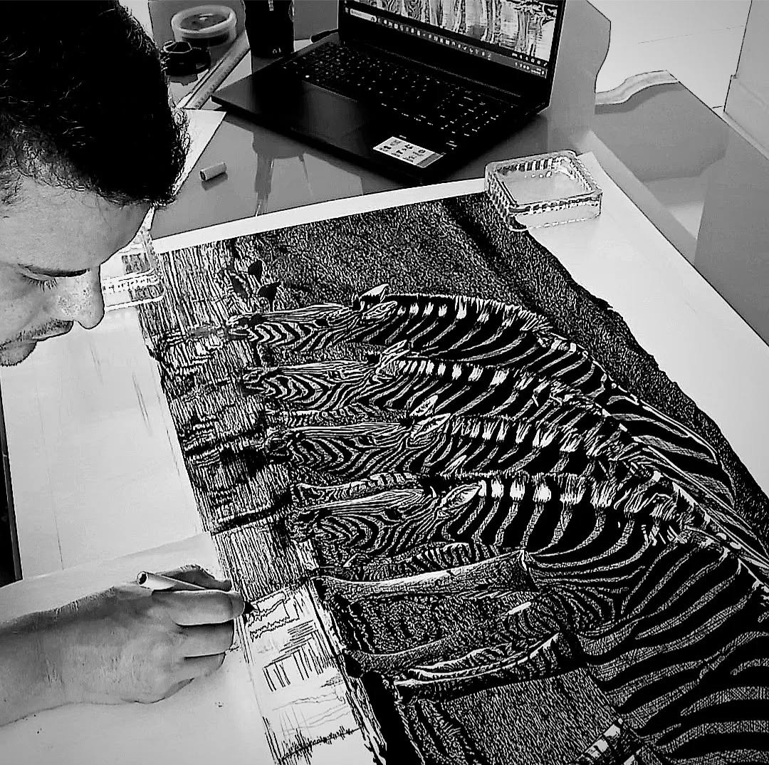 Renato Rocha Ribeiro nasceu em Esperança, uma cidade marcada pela cultura artística local, que influenciou sua formação. Desde cedo, demonstrou interesse por desenho e pintura, explorando técnicas diversas de forma autodidata. Sua primeira exposição individual, intitulada “Imagens”, aconteceu aos 15 anos na Biblioteca Pública de Esperança. Essa exposição foi um marco que abriu portas para futuras oportunidades no cenário artístico local. Renato combina referências ancestrais e modernas em suas obras, conectando o passado e o presente da arte. Ele se inspira na arte rupestre da Gruta de Lascaux, trazendo essa estética para suas pinturas contemporâneas.
