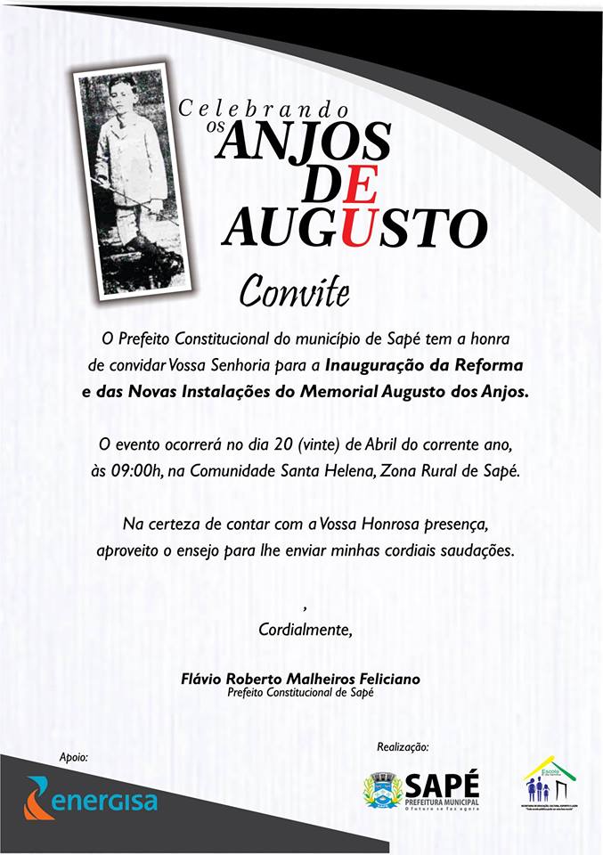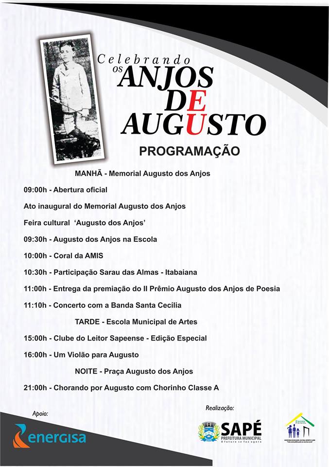 Em comemoração aos 132 anos de nascimento do poeta paraibano Augusto dos Anjos, a Prefeitura Municipal de Sapé, por meio da Secretaria Executiva de Cultura, Esporte e Lazer, realiza na próxima quarta-feira (20), o evento “Celebrando os Anjos de Augusto”.